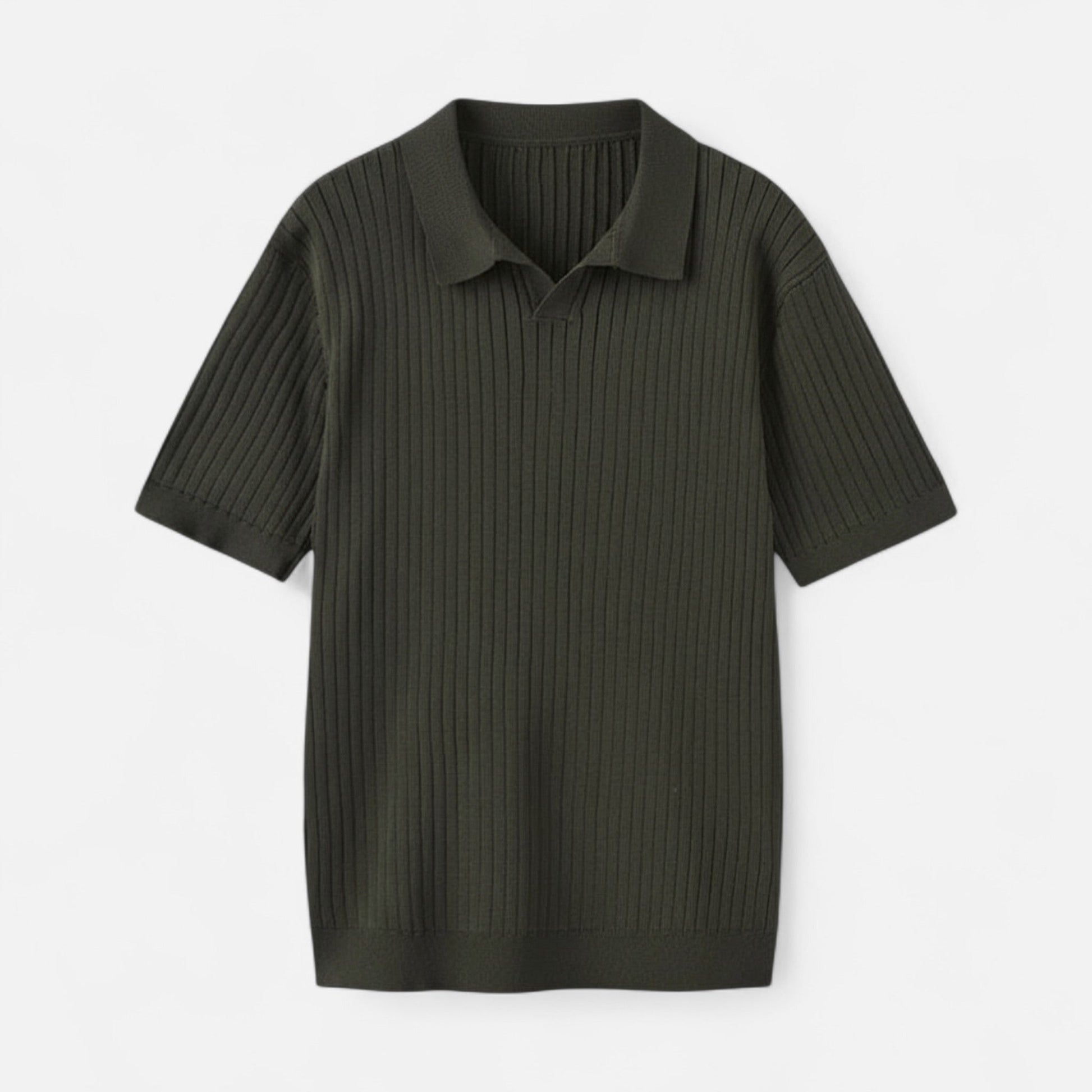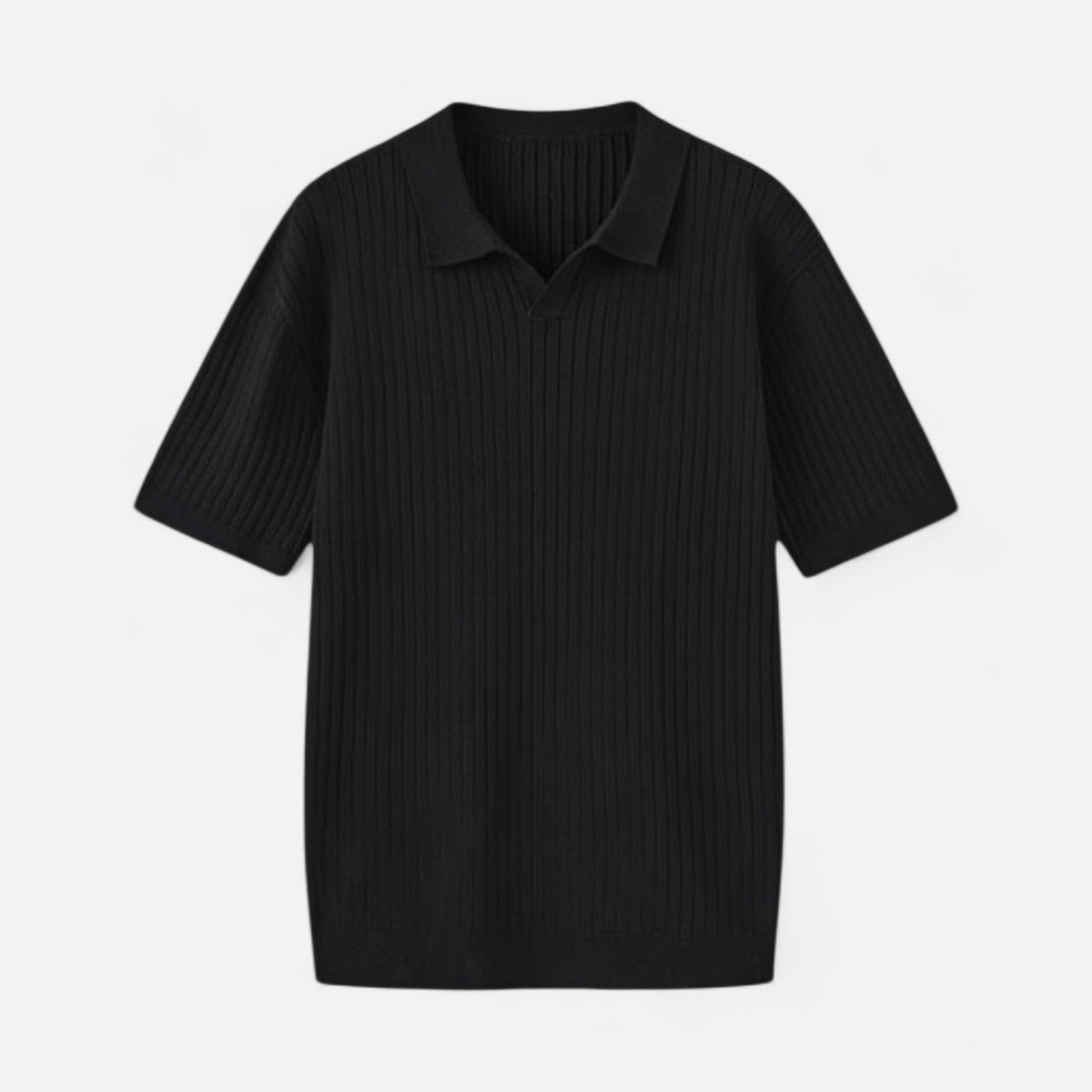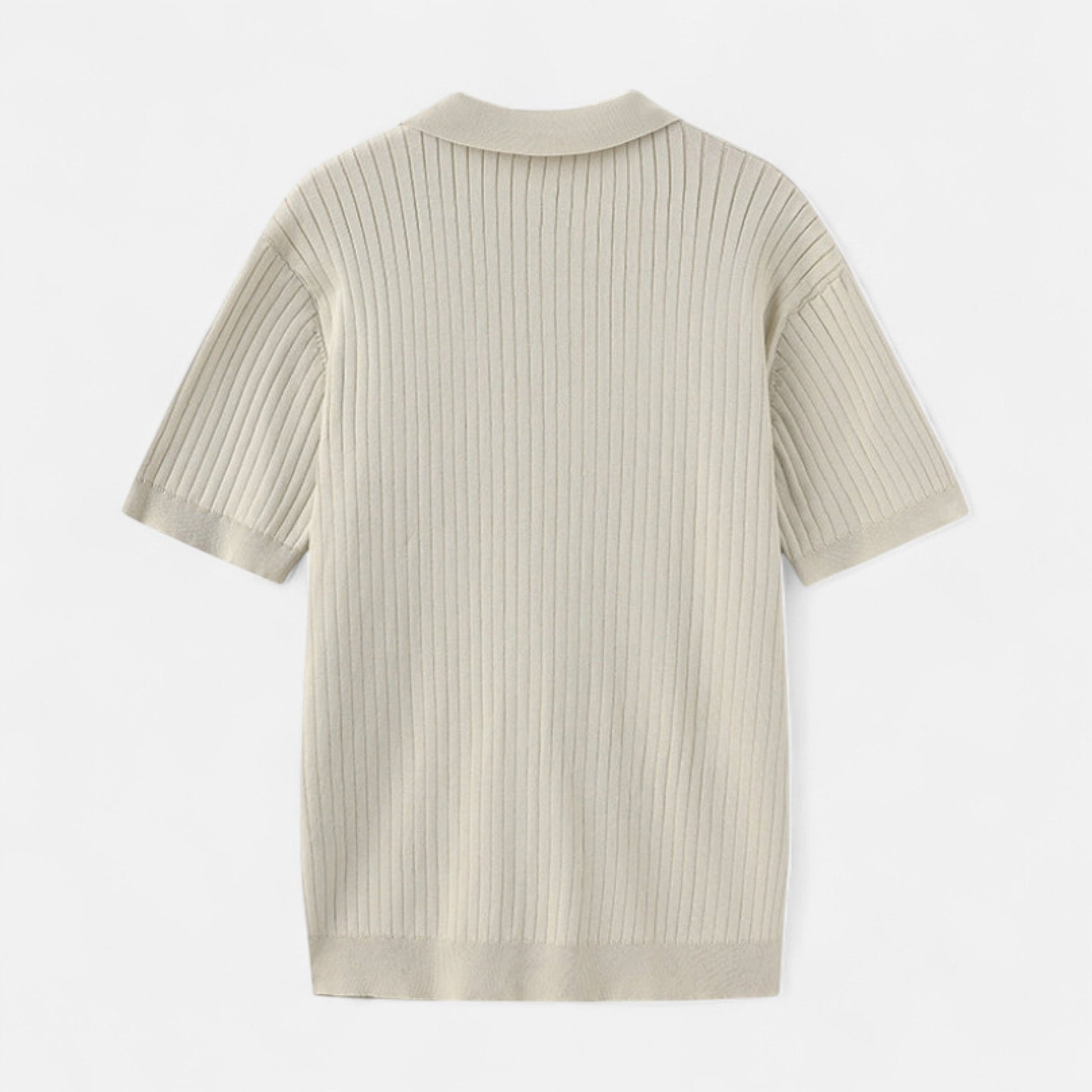 Crafted from lightweight, high-quality polyester, the ribbed fabric provides gentle stretch and shape retention. The open-placket collar adds an air of quiet confidence, while the tailored fit and short sleeves make it a versatile choice for any occasion — from weekday lunches to weekend gatherings.