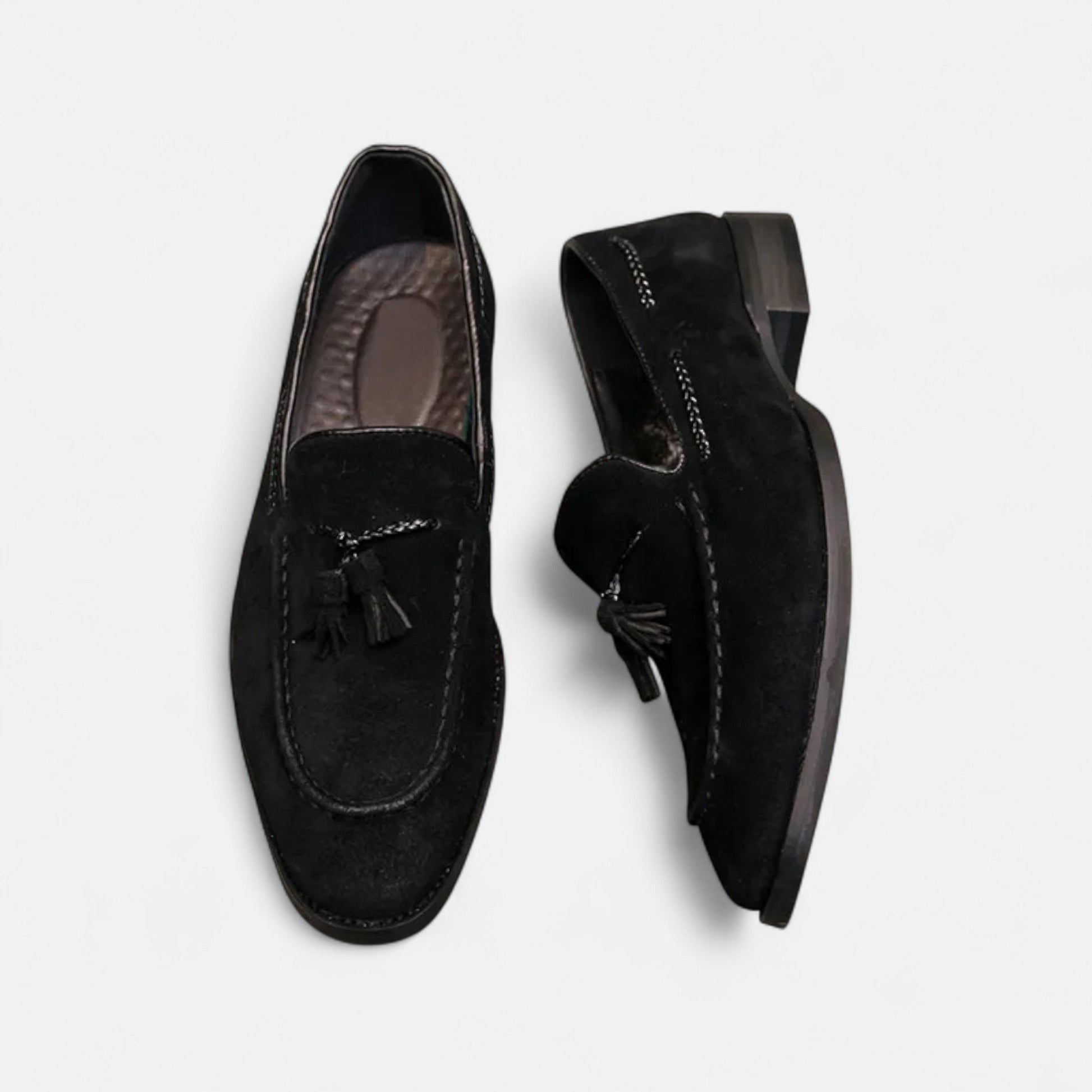 The Velour Boutique | Tassel Loafers combine vintage refinement with modern ease. Crafted from premium first-layer cow suede and finished with tassel detailing, they deliver a timeless look that balances business formality with casual sophistication. The rounded toe silhouette enhances their classic appeal, making them a distinguished addition to any wardrobe.