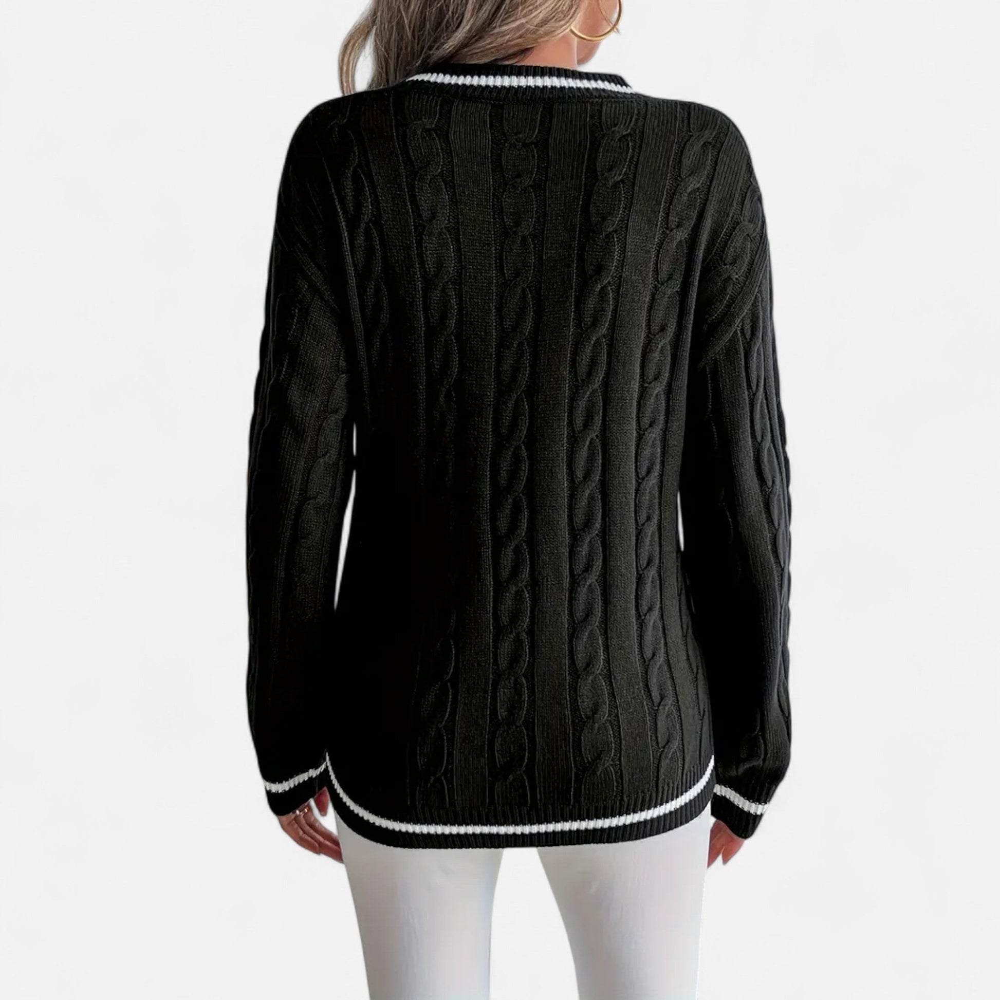 The Velour Boutique | Cable Knit Sweater embodies timeless knitwear with refined detailing. Featuring a graceful V-neckline, striped trim, and drop shoulder design, it delivers a relaxed yet elegant silhouette that transitions effortlessly across all seasons. Ribbed accents highlight its crafted finish, offering a discreet touch of sophistication for every occasion.