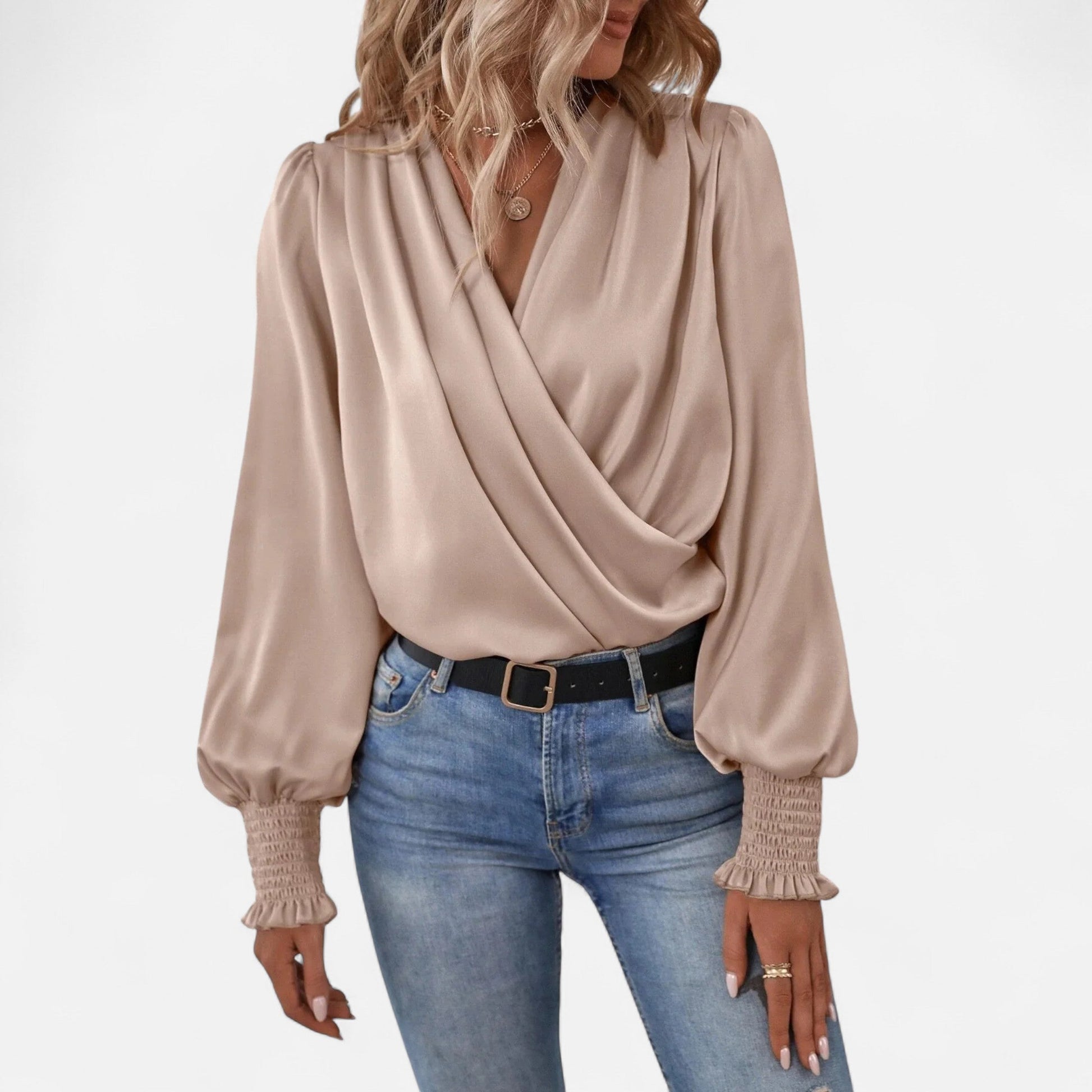 Crafted to balance comfort and refinement, this blouse features a light yet durable structure that drapes beautifully. The lantern sleeves add subtle volume for a distinctive silhouette, while the V-neckline frames the look with understated polish.